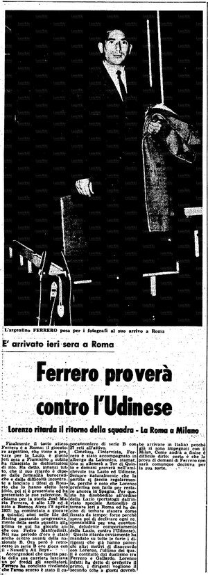 Nell'estate 1963, la Lazio è alla disperata ricerca di un centravanti. E' stato acquistato l'italo-sudafricano Firmani dal Genoa, ma questi dopo vari tentennamenti si rifiuta di tornare a giocare in Italia ed il trasferimento viene annullato. La Lazio si orienta allora sul peruviano Gallardo e inizia una trattativa con il Milan che controlla il giocatore e che chiede in cambio il portiere Cei. L'allenatore Lorenzo caldeggia invece l'acquisto di questo attaccante argentino del Newell's Old Boys che conosce personalmente per averlo allenato in precedenza. Entrambi i giocatori sono annunciati più volte in arrivo a Roma per essere sottoposti ad un provino. Gallardo non arriverà mai e sarà poi tesserato dal Cagliari, mentre Ferrero sbarca finalmente a Fiumicino il 2 settembre 1963, dove viene accolto dal procuratore Latronico.