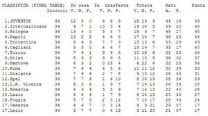 L'inizio del girone di ritorno fu abbastanza positivo, con 4 punti in tre partite, ma fu ancora l'Atalanta a ridimensionare le speranze dei romani, sconfitti per 3-0. Successivamente si registrarono tre buoni pareggi con Milan, Roma e Napoli. La S.P.A.L. battè nettamente la Lazio, 4-1, e la domenica dopo i biancocelesti non riuscirono a battere il modesto Venezia, 1-1. A Milano contro l'Inter la Lazio conquistò un bel pareggio e vinse poi con il Mantova per 1-0. La sconfitta interna con il Brescia, 0-2, fu decisiva in quanto le "rondinelle" si salvarono con un solo punto di vantaggio sui biancocelesti. Dopo un'altra sconfitta a Bologna, alla penultima giornata la Lazio ebbe la meglio sul Foggia. Si giunse così all'ultima giornata con la S.P.A.L. , il L.R. Vicenza e la Lazio affiancate al quindicesimo posto. Alla fine del primo tempo l'Inter è virtualmente campione d'Italia e la S.P.A.L. è in B. Al termine del secondo tempo, con la Lazio che cedette, 2-1, alla scatenata Juventus che vinse così lo scudetto grazie anche alla sconfitta dell'Inter a Mantova e per la vittoria della S.P.A.L. con il Venezia, 3-2 ed il fin troppo tranquillo e chiaccherato pareggio, 0-0, tra Lanerossi e Bologna, furono proprio i biancocelesti a retrocedere in serie B. |
