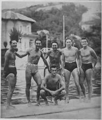 Luglio. Prima di andare al mare Silvio Piola e compagni sono passati ad Acqui, per una breve salutare cura di fanghi. Qui vediamo Piola sul trampolino in procinto di compiere un difficile tuffo. |