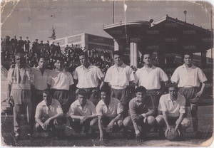 Il Foligno del 1957. Colagiovanni (3° accosciato da sinistra) con gli altri ex laziali Rambotti, Spinosi, Celiberti e Priori. Il portiere è Idilio Cei