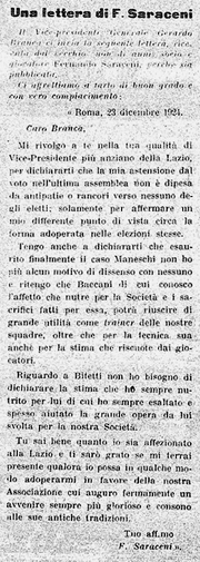 [[Immagine:Lettera FSaraceni 16gen25.jpg|thumb|right|180px|Sulla rivista "Lazio" del 16 gennaio 1925 è pubblicata una lettera di Fernando Saraceni per Gerardo Branca]] |