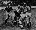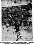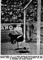 Giovannini è sommerso dai compagni dopo aver parato il rigore di Pantò. Ciò ha consentito alla Lazio di aggiudicarsi il derby del 26 Maggio 1940