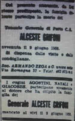 Nella Regia Marina raggiungerà il grado di Ammiraglio. Nel 1936 risulta a disposizione del Ministero delle Colonie e capo della segreteria particolare del sottosegretario della Marina mercantile. Nel 1939 Alceste Grifoni è Capo dell'Ufficio Marina Mercantile del Ministero delle Colonie. (Lloyd's Register of Shipping)