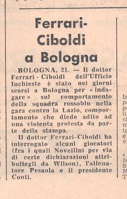 Domenica 6 Maggio 1973, terz'ultima giornata del campionato, la Lazio è di scena a Bologna per una gara basilare nella lotta per la conquista dello scudetto 1972/73. Prima di scendere in campo, la classifica è la seguente: Milan p.41; LAZIO p.40; Juventus p.39. Il Milan è impegnato nella difficile trasferta di Torino contro i granata in 6^ posizione con 30 punti. La Juventus gioca a Bergamo contro l' Atalanta in 10^ posizione con 24 punti. Il Bologna è 7° con 28 punti in zona tranquilla. Sulla carta è un turno facile per per i bianconeri, ma anche la Lazio ha di fronte una squadra che non ha più nulla da chiedere al campionato a 3 giornate dal termine. Eppure la Lazio trova un clima intimidatorio, sia fuori che dentro il campo. Su alcuni giornali appare la notizia che verrà dato un premio partita di un milione ai giocatori rossoblù se battono la Lazio. Perchè e chi mette a disposizione una simile cifra? I felsinei non hanno più nulla da chiedere al campionato. Quando inizia la partita ci si accorge che gli emiliani sembrano giocarsi la finale della Coppa dei Campioni, per quanto impegno ci mettono e quanta cattiveria sui contrasti. La gara è fallosa, e molti giocatori biancazzurri hanno le caviglie tumefatte per la quantità di falli che subiscono. Non poche volte deve entrare il campo la barella. Tra i più accaniti tra i rossoblù, ci sono Novellini, Fedele, Cresci e Roversi. Wilson ha più volte scontri verbali proprio con Novellini. Al 41°, quando segna Savoldi, lo stadio Comunale esplode di gioia e si alzano cori pro Juve e Milan. Perchè tutta questa acredine contro la Lazio? Le due rivali intanto fermano i primi tempi con questi risultati: Torino 2 Milan 0 e Atalanta 0 Juventus 1. Nella ripresa, la partita è ancora più cattiva, ma la Lazio riesce a pareggiare, anche se gli scontri sia fisici che verbali non si placano. Intanto, il Milan riesce a pareggiare 2-2 e la Juventus fa bottino pieno a Bergamo (0-2). A fine gara capitan Wilson accusa apertamente il Bologna di aver preso soldi a vincere da una delle due rivali per la lotta al tricolore, o forse da tutte e due. Cita apertamente Novellini ( Ex giocatore della Juventus, ceduto 7 mesi prima al Bologna in comproprietà, e poi ceduto definitivamente ai rossoblù alla fine del campionato) , come delatore, in campo, della storia del premio a vincere, e questo fa scattare l'ufficio indagine. Il tutto è amplificato anche dalla stampa che accusa apertamente il Bologna di aver giocato alla morte e sprona la lega a "vederci chiaro". L'ufficio indagini, nella persona del Dott. Aldo Ferrari Ciboldi (un possidente di Cremona, collaboratore della Lega) si mette subito in moto, interrogando i giocatori biancocelesti, che confermarono le frasi dette in campo e udite dai giocatori felsinei, che parlavano, sbeffeggiandoli, di aver ricevuto promessa di un premio a vincere se battevano i biancazzurri, mentre i giocatori del Bologna negarono tutto. Furono interrogati anche il presidente e l'allenatore del Bologna che dissero di essere completamente ignari di ogni cosa e che erano tutte fantasie. Purtroppo in mancanza di prove certe non fu possibile accertare la verità e il caso fu archiviato nel Luglio 1973