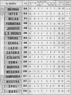 CLASSIFICA: Bologna e Inter 54; Milan 51; Fiorentina e Juventus 38; L.R. Vicenza 36; Torino 35; Genoa, Lazio, Catania e Atalanta 30; Roma e Mantova 29; Messina 28; Sampdoria e Modena 27; Spal 24; Bari 22.
