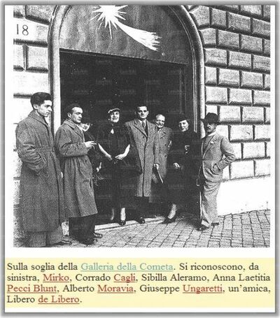 La Galleria della CometaNel 1935, l'anno della II Quadriennale, si apre a Roma la piccola Galleria della Cometa, guidata da Corrado Cagli e Libero de Libero e voluta dalla contessa Mimi Pecci-Blunt; prende il nome da un segno araldico di papa Leone XIII nello stemma di casa Pecci. È la centrale del tonalismo romano, con aperture all'espressionismo. I locali sono costituiti da due piccole sale, molto eleganti. Così le ricorda Oppo ("La Tribuna", 1935): "Le pareti rivestite di iuta giallognola, pavimenti in linoleum verdeoliva cupo, candidi soffitti, illuminati con sobrietà, un angoletto di riposo nella parte più segreta della galleria." Incastrata nel muro, a fianco dell'ingresso, c'è una colonna romana con capitello ionico. Rimane attiva fino all'estate del 1938 (dal 1937 con una succursale a NewYork), e viene chiusa per incidenti legati alla politica razziale del regime. Si inaugura il 15 aprile 1935 con una mostra di 50 disegni di Corrado Cagli, presentato da Massimo Bontempelli. Interviene all'inaugurazione la principessa di Piemonte; Bottai, amico della contessa, e Alfieri presenziano spesso alle vernici. Le presentazioni delle mostre si debbono quasi sempre a letterati, piuttosto che a critici: Bontempelli, Ungaretti, Alvaro, Scarfoglio, Cecchi, Solmi, de Libero, de Chirico, Savinio, Barilli, Soffici, Sinisgalli, Moravia, Carrà, Montale. Fra le mostre della Galleria della Cometa, ricordiamo quella di Cagli (aprile 1935); del 1936 sono Mirko (gennaio), Cagli (gennaio), Janni (aprile), Castellucci e Pincherle (maggio), Melli (novembre). Tra le personali del 1937, Galassi (febbraio), Manzù (marzo), Afro (aprile), Levi (maggio), disegni di de Chirico (novembre); del 1938, Pirandello (gennaio), Tosi (febbraio); mosaici e affreschi di Severini (marzo), Guttuso (marzo), Messina (aprile), Paulucci (maggio), Montanarini (giugno). L'annata 1938 si chiude con una mostra di 50 disegni di Vincenzo Gemito della collezione Minozzi. Fra gli altri nomi presentati dalla Galleria della Cometa, ricordiamo Mafai, Melli, Colacicchi, Menzio, Tallone, Sclavi, Tomea, Milena Barilli, Quinto Martini. Nel 1937 la Galleria della Cometa inaugura la sua succursale a New York, nei pressi della Quinta Strada. La prima mostra è un'antologica di pittura italiana; seguono personali di Cagli, Mirko, Carrà, de Pisis, Severini, Levi, di Cocco, e un'antologica del disegno italiano contemporaneo. Per comprendere l'importanza del ruolo della Galleria, è utile questa osservazione di de Libero ("Domus", 1938): "E' la prima volta che la città di New York, ove le gallerie d'arte francesi dominano il mercato e l'attenzione, si rende esatto conto della nostra arte contemporanea..."