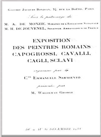 Ezio Sclavi e il suo sodalizio artistico con Corrado CagliE' in questo contesto variegato e stimolante che si inserì la personalità artistica di Ezio Sclavi. Fu molto influenzato da Corrado Cagli (Ancona 1910 – Roma 1976), cui fu legato da un rapporto personale e professionale strettissimo. Cagli, personalità vivace ed irrequieta, animata da un'intelligenza fantasiosa e critica, impostò la sua indagine su un persistente sperimentalismo tecnico ed espressivo. Secondo lui l'artista è colui che si esprime attraverso un concetto globale dell'arte e che congiunge e giustifica la sua specifica operatività all'interno di un contesto culturale e ideologico. La sua opera fu caratterizzata da scelte poliedriche che lo videro spaziare dal figurativo all'astratto, dall'espressionismo all'informale, dal geometrico allo spaziale e al realismo magico. Si cimentò nelle più disparate tecniche artistiche ampliando il suo interesse anche verso la scultura e la scenografia. Questa sua febbrile varietà di ricerca non va considerata come improduttivo ecclettismo, ma come coerente applicazione di un credo etico-creativo che impone all'artista di percorrere tutte le strade che lo possano condurre all'unità dell'assoluto. Nel 1932 Cagli tenne la sua prima mostra personale insieme ad Adriana Pincherle nella "Galleria d'arte di Roma". Tra le altre cose, espone fotomontaggi di soggetto sportivo. Nello stesso anno si avvicina a Giuseppe Capogrossi ed Emanuele Cavalli. Formato insieme il gruppo della "Nuova pittura Romana", alla fine del 1932 a Roma, i tre artisti espongono nella "Galleria d'Arte di Roma" e nel 1933 a Milano nella galleria "Il Milione". Verso la fine dell'anno mentre stilavano il "Manifesto del Primordialismo Plastico", da pubblicarsi in occasione della loro mostra a Parigi nella "Galerie Bonjean" (dicembre 1933), litigano a causa di divergenze teoriche e questioni pratiche e sciolgono definitivamente il sodalizio. Vicino a Cagli rimase, per una consonanza artistica ed esistenziale consolidata, Ezio Sclavi. Sebbene nei primissimi anni trenta Cagli, che era di famiglia ebrea, avesse eseguito lavori coerenti con il pensiero fascista, soprattutto pitture murali, progressivamente maturò sentimenti liberi ed antagonisti che culminarono con il suo trasferimento a New York, anche a causa della politica razzista attuata dal regime. Prese la nazionalità statunitense e partì soldato per combattere i nazifascisti tanto da partecipare allo sbarco in Normandia. Tornato in Italia nel 1948, fu uno dei protagonisti di sperimentazioni neometafisiche, neocubiste ed informali caratterizzate sempre e comunque da un percorso coerente e severo.