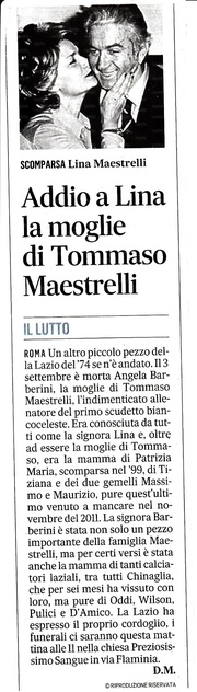 Si è fermato un altro cuore di Lazio. Quello della signora Lina, moglie e prima ancora compagna di vita di Tommaso Maestrelli. Aveva 91 anni e da tempo era malata, assopita, afflitta dalla sindrome che spesso colpisce le persone anziane. Della Signora Lina (Angela Barberini) ci sono solo immagini sbiadite dal tempo. Quelle, rarissime, con il suo Tommaso in momenti felici fuori dal campo. Una, bellissima, conservata negli archivi di LazioWiki, del Natale del '75, l'intera famiglia Maestrelli riunita prima che una tempesta senza fine, un destino senza pietà, si abbattesse sugli affetti più cari: due figlie, Patrizia Maria e Tiziana e poi due gemelli, Massimo e Maurizio, accanto al suo "Masino". Figlia di un vigile urbano di Bari, conosciuta da Maestrelli negli anni della sua permanenza nel capoluogo pugliese, ci piace ricordarla come fanno spesso i "suoi ragazzi", da Giancarlo Oddi a Felice Pulici, quelli che ai tempi dello scudetto si riunivano a volte a casa Maestrelli, con Chinaglia e Re Cecconi, per uno spaghetto veloce che la provetta cuoca portava in tavola anche all'ora tarda: è stata per tutti una mamma, donna forte, energica, capace di sopportare dolori interminabili, ferite inguaribili. Una consigliera silenziosa prima, depositaria di valori incommensurabili dopo la scomparsa tragica del capofamiglia. La Signora Lina è stata magnificamente portata in palcoscenico dall'attrice palermitana Aglaia Mora in "Tommaso Maestrelli, l'ultima partita". Molti l'hanno potuta conoscere grazie proprio a questa interpretazione.
