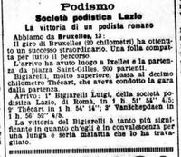 I risultati ottenuti e la conseguente fama acquisita portano Luigi Bigiarelli ad essere considerato un importante podista nel panorama pedestre italiano. Una riprova di ciò la possiamo trovare in un articolo de "La Gazzetta dello Sport" del 3 marzo 1903 (v. foto pubblicata) nel quale è riportata la notizia della visita di Luigi presso il Club podistico "Libertas" di Milano dove, acclamato e festeggiato, viene nominato socio onorario del sodalizio meneghino. Dopo appena un anno dal suo trasferimento, nell'aprile 1903 Luigi e Giacomo Bigiarelli ritornarono a Roma, forse per completare il trasloco, dove, come confermano i giornali dell'epoca, fu accolto con grande entusiasmo dalle società podistiche. Ad agosto Luigi e Giacomo partecipano ad un match di waterpolo ad Anzio (v. foto del ritaglio de "Il Messaggero"). Luigi Bigiarelli morì giovanissimo, a 32 anni, a Bruxelles il 16 febbraio 1908 probabilmente per una polmonite trascurata. La Gazzetta dello Sport comunicò la notizia della scomparsa con accenti commossi, ricordando che Luigi, nel frattempo, come atleta della Lazio, era diventato Campione mondiale di marcia podistica. La Gazzetta dello Sport del 2 marzo (v. foto) ne dava così notizia: "Qui non si parla di una nuova vittoria del forte marciatore romano. Da molto tempo Luigi Bigiarelli aveva abbandonato il suo sport preferito, pur rimanendo un amico appassionato, non dimenticando anche, nei brevi momenti lasciatigli liberi dalla sua professione, la nostra Gazzetta alla quale spesso collaborò.
