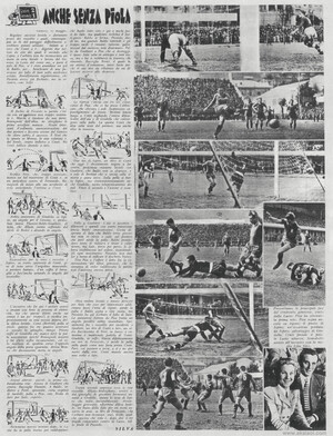 L'incontro, che fin qui è andato avanti a strappi (sta bene la penuria di elettricità, ma che questi difetti anche sui campi è un po' troppo!) si vivifica improvvisamente su una mezza papera della difesa laziale. Conti palla al piede, guizza fra tre quattro avversari e, trovato lo spiraglio, stanga. Pronto tuffo di Gradella che manca però la palla unicamente perché Romagnoli davanti a lui gliela soffia incautamente, col solo risultato di spedirla verso l'opposto angolo della porta sguarnita. Arriva Monza che decisamente mette in angolo.
