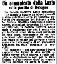 La Lazio ha avuto un gioco a scatti e discontinuo. Efficacissimo e pericoloso in certi momenti, assolutamente innocuo in altri. Rabbiose ed energiche le sue reazioni nella ripresa, quando al minaccia del pareggio spronava i suoi uomini e il Bologna attraversava un attimo di crisi per l'invalidità di Schiavio. Malatesta, Ziroli, Foni, Furlani, sono apparsi i migliori mentre la linea dei terzini ha rivelato specialmente nel primo tempo, difetti evidenti. La partita, che è stata arbitrata da Scarpi del Dolo, si è iniziata con un attacco della Lazio. Poi hanno cominciato i bolognesi che al 19° ottengono il primo goal. Un calcio di punizione, un perfetto tiro parabolico di Busini I e la palla entra in rete dopo avere sfiorato la parte inferiore della traversa. Al 24°, dopo una serie di attacchi nutriti del Bologna, si ha il secondo punto della giornata, marcato da Muzzioli su passaggio di Della Valle.