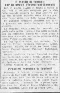 Attratto da una tiepida, magnifica giornata, un pubblico insolitamente affollato ha assistito alle gare di calcio per la conquista della Coppa Viscogliosi-Baccelli, svoltasi nel pomeriggio in Piazza d'Armi fra le due seconde squadre del Club Sportivo Virtus e della società Podistica Lazio. Le previsioni però degl'intenditori per cui avremm dovuto assistere ad un match molto interessante, andarono completamente fallite: dappoichè il team della Lazio con superiorità incontestabilmente impressionate, ha vinto con estrema facilità battendo l'avversario con 5 goals a zero. Le squadre erano così composte:
