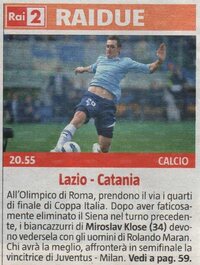 La Gazzetta dello Sport titola: "Lazio-Catania 3-0 in Coppa. Si qualifica per la semifinale. La squadra di Petkovic centra il 13° risultato utile consecutivo, in Coppa Italia. Segna Radu al 30' del primo tempo, poi doppietta di Hernanes nel secondo. Catania sfortunato sottoporta: palo di Izco sullo 0-0. I biancocelesti affronteranno la vincente di Juventus-Milan".