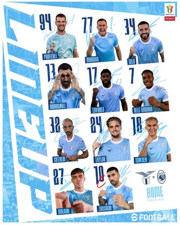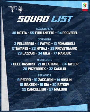 LAZIO: Provedel, Marusic, Gila, Romagnoli, Nuno Tavares, Dele-Bashiru, Cataldi, Taylor (82' Belahyane), Isaksen (64' Cancellieri), Maldini (76' Dia), Zaccagni (76' Noslin). A disposizione: Motta, Furlanetto, Patric, Provstgaard, Lazzari, Hysaj, Pellegrini, Przyborek, Ratkov, Pedro. Allenatore: Sarri.