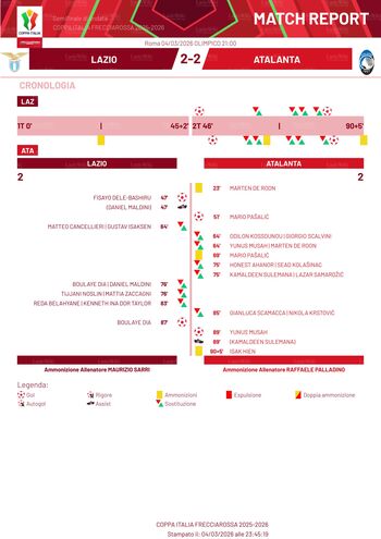 Mercoledì 4 marzo 2026 - Roma, stadio Olimpico - Lazio-Atalanta 2-2