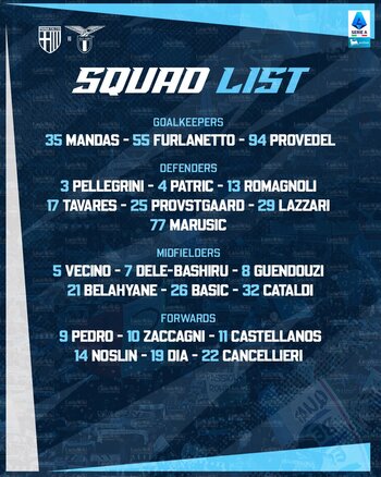 LAZIO: Provedel, Marusic, Patric (69' Provstgaard), Romagnoli, Pellegrini, Guendouzi, Cataldi (88' Vecino), Basic, Cancellieri (69' Dele-Bashiru), Castellanos (69' Noslin), Zaccagni. A disposizione: Mandas, Furlanetto, Lazzari, Nuno Tavares, Belahyane, Vecino, Pedro, Dia. Allenatore: Sarri.