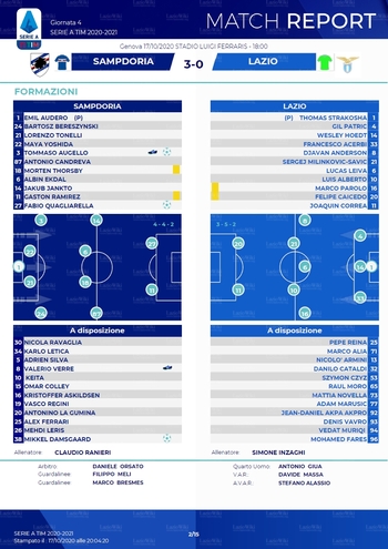 Sabato 17 ottobre 2020 - Genova, stadio L. Ferraris - Sampdoria-Lazio 3-0