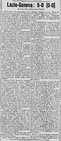 Note: giornata molto bella ma fredda. Terreno ottimo. Genova 1893 in 10 per infortunio a Stabile. Presenti in tribuna molte alte personalità tra le quali il Duce. Dopo il 5° gol subito dal Genoa, Levratto a centrocampo è stato colto da una crisi di pianto. Il pubblico laziale ha ritmato il suo nome per incoraggiarlo e il giocatore ha potuto riprendere il gioco.